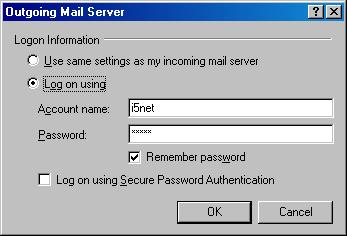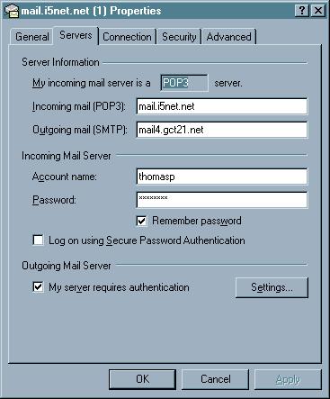 Alternate Outgoing Mail Setup Options: We have acquired permission to utilize an alternate mail server, which uses SMTP authorization in addition to the "POP before SMTP" authorization that our servers do. The problem with the POP authorization is that it can take between 30 seconds and 5 minutes for our servers to identify your IP address after you check your mail and make the necessary changes that would permit you to send mail. This alternate scheme eliminates the time delay but requires special settings in your email software. See the special setup instructions below: The email account "thomasp", shown below, is fictitious. Replace this information with your account's "user name" and "password". Also, do not replace the "Incoming Mail POP3" setting. It should be "mail.i5net.net" for all i5net accounts.