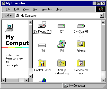 I've never been satisfied with the factory windows FIFO buffer settings! What is it? I really don't know other than it helps to control the communication between the CPU in your computer, the cache in your modem and the cache in the modem at the other end of your phone line. When the first programmed windows and modems computers were much slower. Now it seems all the programming companies must not use modems or they would know the standard settings don't work for modern communication speeds. They'll tell you they work in their lab tests, where one computer is calling a computer 25 feet away and the whole communication is occurring on brand new equipment, but reality for us internet users is old phone lines, lots of static and cheap modems. The common answer : Believe it or not, the most common answer to this problem is to get really frustrated until the point when you order DSL or some other kind of service. 99% of the internet users would be satisfied with modem speeds if their modems would just stay connected. We'de love to sell you DSL, but you would probably be just as satisfied by making the following simple (FREE) modification to your modem settings. It solves most connection problems in minutes! Let's start = = > On your desktop double-click the "My Computer" icon. this will bring up a window like the following: Double-Click on the "Dial-Up Networking" icon. It will bring up the networking window: